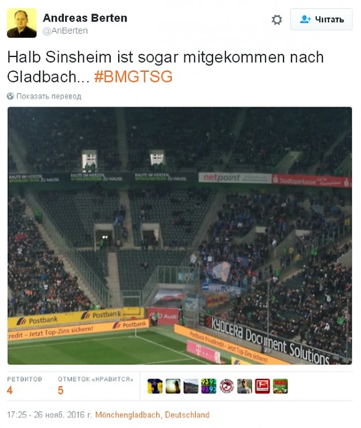 Ну и напоследок - немного печальное количество болельщиков «Хоффенхайма», добравшееся в субботу до Вестфалии.