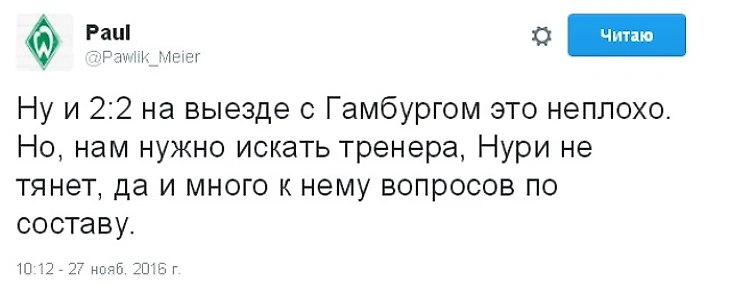 Отступать некуда, впереди еще один неудачник – «Вердер». Дела у бременцев не складываются, даже несмотря на неплохую игру одного из героев Рио-2016 Сержа Гнабри. Некуда так некуда, решили в «Гамбурге» и забили уже на 2-й минуте игры (Грегоритш). Такое бодрое начала задало темп первой сорокапятиминутке – «Вердер» быстро сравнял (Бартельс, 14-я минута), хозяева вновь вышли вперед (дубль на счету Грегоритша), но на последней минуте тайма, как оказалось, был установлен окончательны счет (Гнабри).