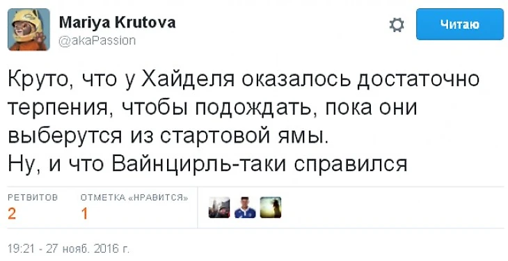 После этой игры «Шальке-04» уже может поглядывать на вершину турнирной таблицы, прикидывая, кто же там занял его место. Ужасно начав чемпионат (5 поражений кряду), гельзенкирхенцы постепенно набирают ход. У команды 7 матчей без поражений в Бундеслиге и 100-процентный результат в Лиге Европы. Сейчас команду даже не смущает быстро пропущенный гол (Хеллер). «Рудокопы» отвечают двойным ударом – гол (Колашинац) и пенальти. Последний, правда, забить не удалось, но «Шальке» недолго горевал, и вот уже тот, кто пенальти не забил, исправляет свою оплошность (Шупо-Мотинг). А в концовке гостей добили (Шопф).