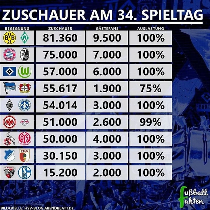 Вот такой посещаемостью матчей порадовал нас 34 тур немецкой Бундеслиги.