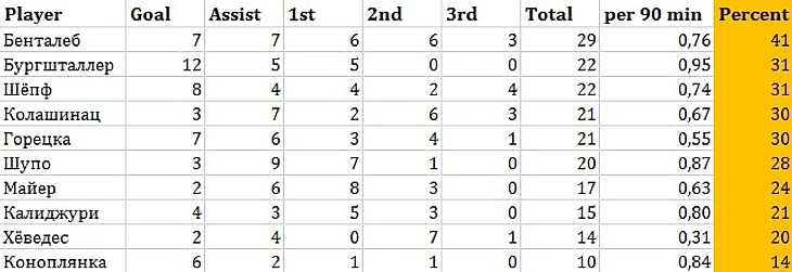 Потом Набиль Бенталеб. Сначала арендованный, а затем купленный у «Тоттенхэма» алжирец и вовсе по GoalChain имеет наивысшую вовлеченность в построение атак. Именно Бенталеб является ключевой фигурой в «Шальке», управляя игрой в центре поля и наиболее эффективно участвуя в создании голевых атак. Он особенно силен точными сквозными передачами (лидер лиги), а также способен создать гол, например, отрезающим защиту «черпаком». Блестящую связку в центре поля с Бенталебом образует прогрессирующий (жаль только, с туманным будущим) Леон Горецка, выполняющий огромный объем работы. В этом сезоне он стал лидером «Шальке» и игроком краеугольным. Неудивительно, что Хайдель хочет строить команду именно вокруг него.
