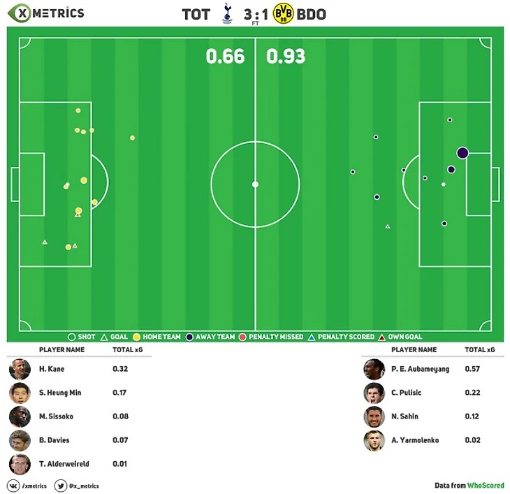 Моменты Сона и Кейна в начале второго тайма в xG конечно недооцениваются (из-за дистанции удара я так понимаю), хотя по сути самые что ни на есть голевые, т.к. никто практически не мешал при ударах. Кейн вообще такие 3 из 4 в ворота кладет.