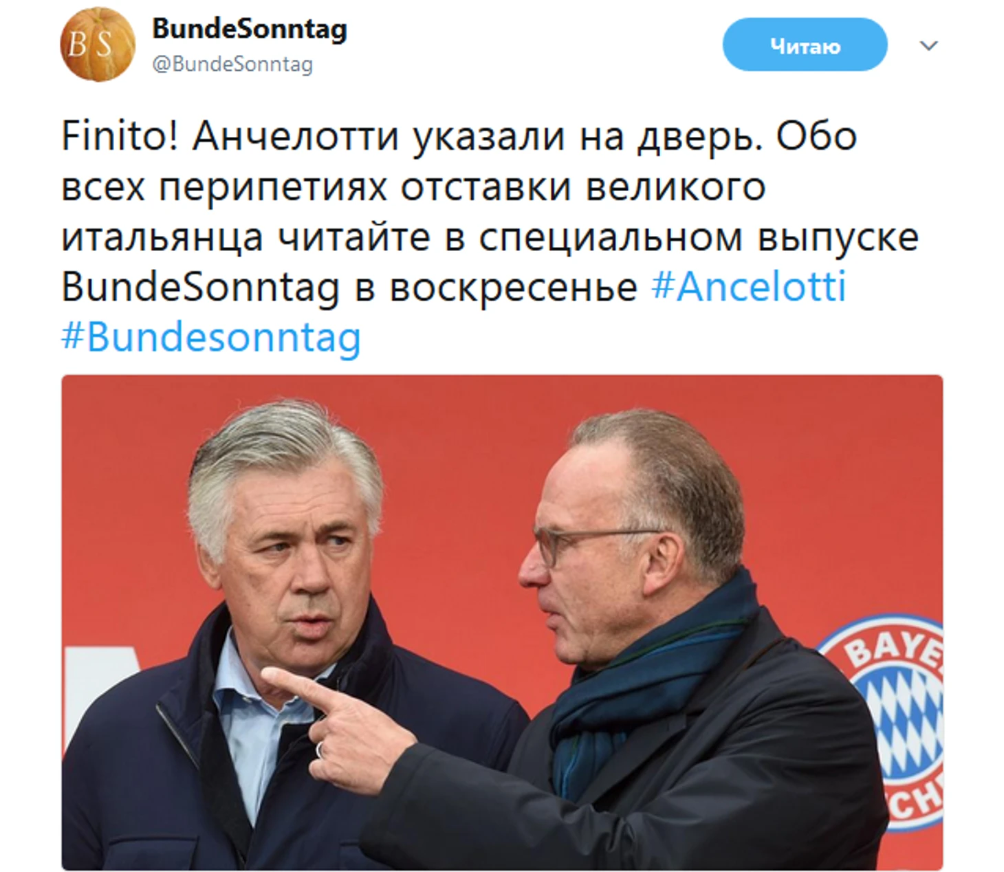 Читайте на страницах нашего блога специальный выпуск BundeSonntag, посвященный отставке Анчелотти. Подробности, инсайд, слухи, комментарии – ждут вас в воскресенье вечером.