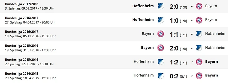 В 2017 году мюнхенцы проиграли оба матча "Хоффенхайму", ни разу не забив при этом (0:2, 0:1). Справедливости ради стоит заметить, что обе встречи состоялись в Зинсхайме