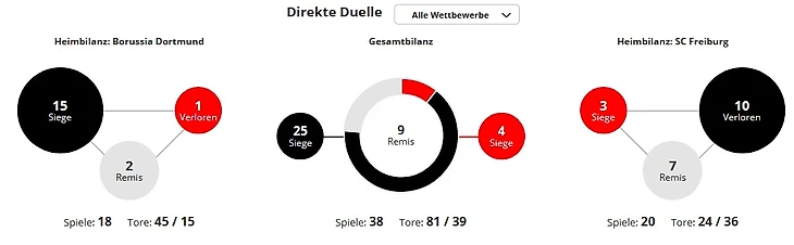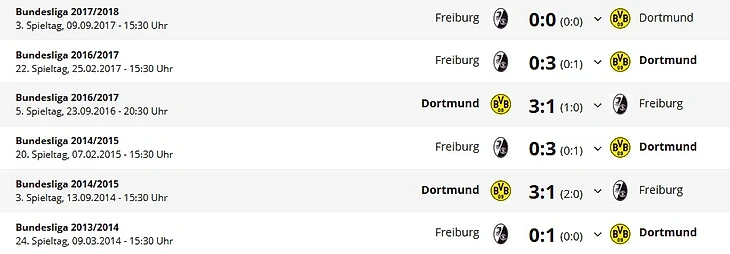 На протяжении 13 игр фрайбуржцы не могут выиграть у дортмундцев (12 поражений, 1 ничья)
