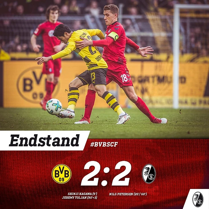 И это едва не сработало. Но на 93-й минуте Жереми Тольян спасает остатки дортмундской чести. Подача Ярмоленко с правого фланга, защитник «Фрайбурга» выигрывает верх, но выбивает мяч прямо на ногу защитнику «Боруссии». Тот с лета пробил в дальний угол. Сказать, что игроки гостей были разочарованы – значит не сказать ничего.