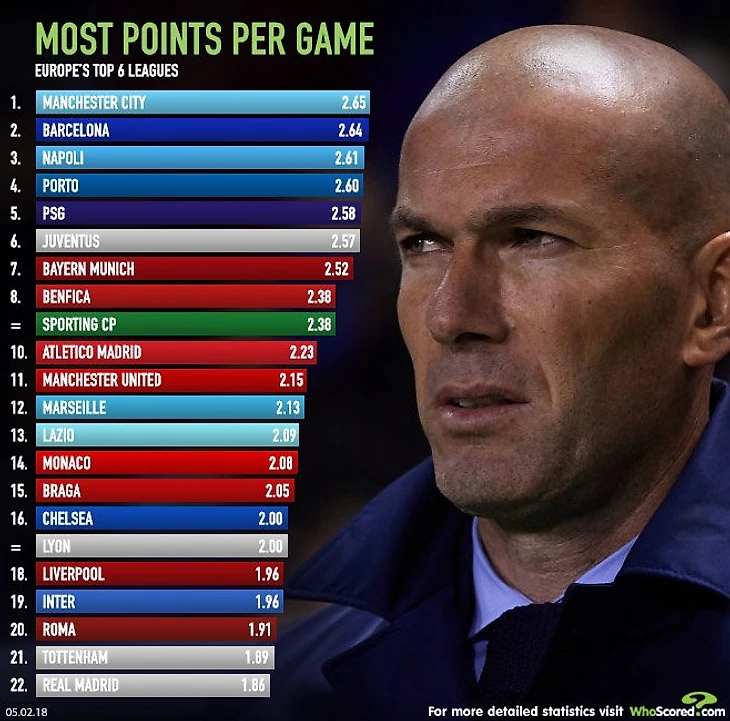 Среднее количество очков этого сезона в шести лучших чемпионатах Европы