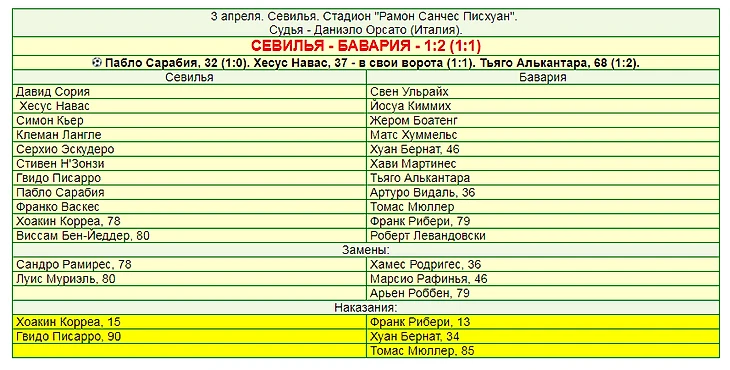 Француз понял слова своего главного тренера правильно и провел один из своих самых полезных матчей за последнее время. Оба мяча, которые забили мюнхенцы в ворота «Севильи», забивались именно с передач Рибери. И если в первом случае, француз помог защитнику хозяев Хесусу Навасу (’37), то во втором голе Рибери ассистировал своему одноклубнику Тьяго Алькантаре (’68).
