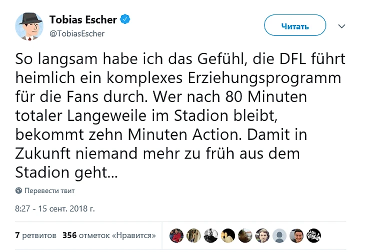 О том, что болельщики часто уходят за 10 минут до конца матчей, и о большинстве забитых в туре мячей на последних минутах: «Я чувствую, что Немецкая футбольная лига тайно проводит сложную воспитательную программу для болельщиков. Тот, кто остается на стадионе после 80 минут полной скуки, получает 10 минут экшена. Так что в будущем никто не будет покидать стадион слишком рано...»