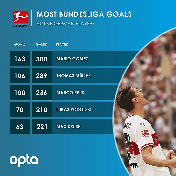 Лучшие бомбардиры Бундеслиги среди действующих немецкий футболистов. С отрывом лидирует юбиляр тура Марио Гомес.