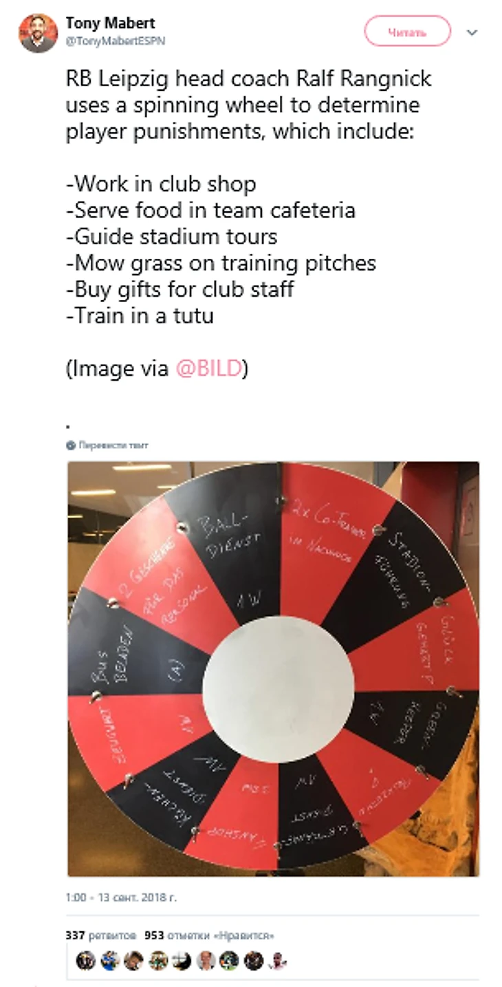 Новая система наказания от Рангника. Тренер «РБ Лейпциг» Ральф Рангник использует крутящееся колесо, чтобы определить наказание для игрока, куда входят: работа в фаншопе, работа в кафетерии для команды, проведение экскурсии по стадиону, косить траву на поле для тренировок, покупка сувениров для членов команды, тренировка в балетной пачке.