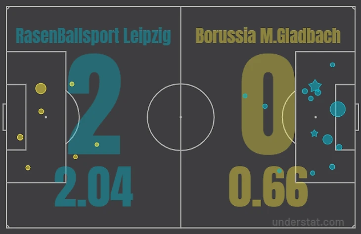 Серьёзность своих намерений «Лейпциг» показал уже на второй минуте, когда при численном преимуществе гладбахцев 6 в 3 Вернер выкрутился из целой толпы противников, вытащил за собой мяч и пробил по воротам. Так закончился для него месяц без голов за клуб.