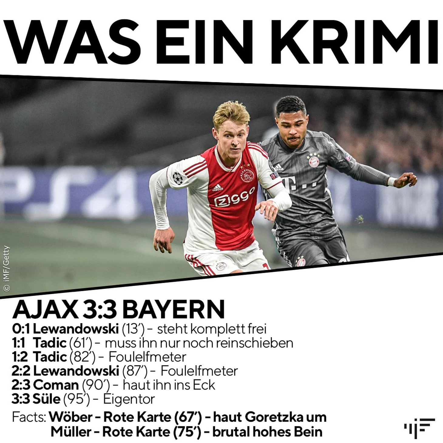 Сдерживать все слова о феерии и безумии в матче 6-го тура в группе С между мюнхенской «Баварией» и амстердамским «Аяксом» было бы сложно даже самому завзятому футбольному снобу — лучше, конечно, такой матч увидеть. Особенно второй тайм, где игра перешла в настолько закручивающий триллер, что даже целых семь добавленных минут пролетели так быстро, что главный судья — француз Клеман Тюрпен — как будто явно не хотел заканчивать матч, желая подольше насладиться происходящим. Ситуация в турнирной таблице к 6-му туру обе команды вполне устраивала. Голландская команда только однажды потерпела в сезоне поражение — в матче с ПСВ, но, даже обеспечив себе твердое попадание в плей-офф, «Аяксу» не терпелось самоутвердиться в матче с таким крепким, пусть и терпящим нестабильные настроения в текущем сезоне, соперником, как «Бавария». «Бавария» же, даже по итогу матча застолбившая себе правда быть в группе «сеянных» при жеребьевке, была настроена решительно, ведь набирать по паре очков за 4 матча после убедительных серий побед явно не в духе баварцев — впрочем, болельщики остальных команд бундеслиги в этом сезоне наконец-то выглядят особенно заинтересованными, а игроки — мотивированными.