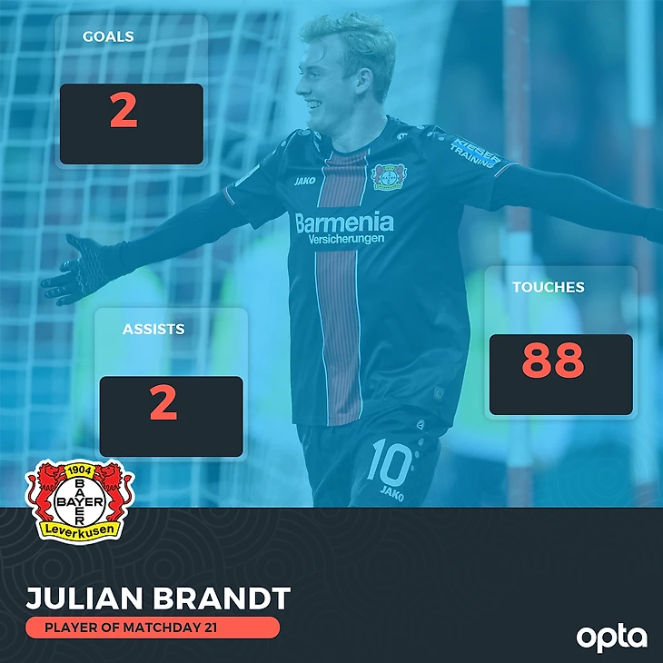 Брандт в своей 200 игре в Бундеслиге впервые реализует дубль за Леверкузен. При этом Юлиан участвовал в реализации четырех мячей за один матч — впервые игрок «Байера 04» со времен встречи в декабре 2015 года показал такой же результат, как отличившийся тогда Кисслинг.