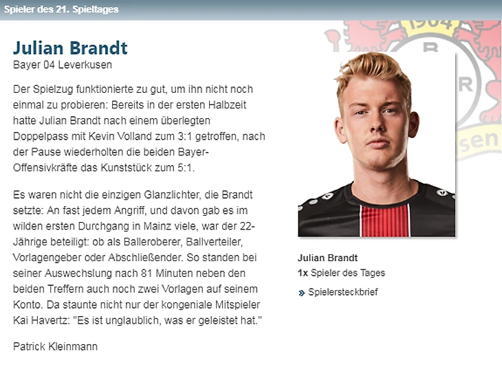 Лучшим игроком матча стал Юлиан Брандт – и дело не только в дубле. Молодой хавбек еще и успел отдать две передачи и стать настоящей грозой «Майнца» в этом матче. Он всегда был на секунду быстрее – и в принятии решений, и в работе с мячом.