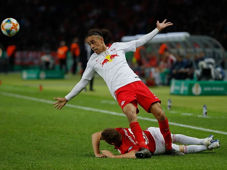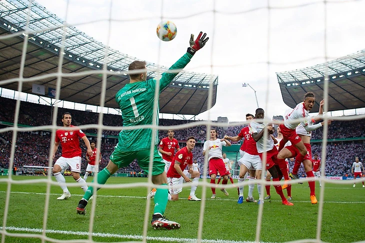 Команды сразу дали понять, что повторения недавней совместной нулевой ничьей не будет – Рангник до игры не раз заявлял, что финал кубка – время уходить от закрытой тактики. Однако у лейпцигской команды это получалось не всегда. Тем не менее, начало первого тайма ушло в актив именно номинальным хозяевам матча. «РБ Лейпциг» расположился по обтекающей схеме 4-1-2-1-2, поместив Адамса чуть ниже полузащиты, позволив таким образом захватывать ему больше пространства. «Бавария» же выбрала путь избирательности и остроты в мелких действиях – отличным представителем такого стиля на поле в этот вечер был Кингсли Коман, отлично сочетающий умения вести мяч на ходу, быстро передвигаться и еще более быстро перестраиваться по ходу эпизода. Короткие и средние пасы позволяли мюнхенцам играть в «наклад» – подобно, скажем, приготовлению выпечки из слоеного теста. Такая «сладкая» тактика заставляла уходить «Лейпциг» в очень высокий прессинг. Активнее всех в этом плане был Юссуф Поульсен, несмотря на то, что по ходу всего матча рослому форварду из-за этого доставалось больше всего толчков и подножек. Тем не менее, датчанин и организовал первый голевой эпизод в матче – на 10-й минуте «быки» заработали угловой, в ходе розыгрыша которого Хальстенберг (лучший ассистент среди защитников «Лейпцига» в этом сезоне, к слову) буквально взлетел над землей и навесил в центр вратарской, откуда Поульсен отлично пробил головой. Однако сейв, совершенный Мануэлем Нойером, был потрясающим. Забегая вперед, хочется сказать, что Нойер в этом матче сыграл куда большую роль, чем казалось бы, при итоговом исходе матча – каждое движение ногой или рукой напоминало действие кукловода, как бы разворачивавшего игру в выгодную в данный момент сторону.