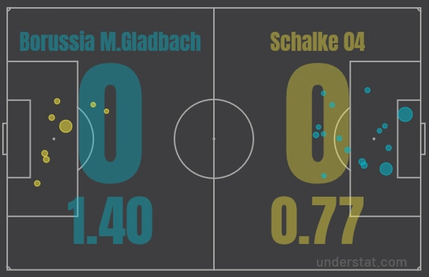 Хоть жесткая игра гельзенкирхенцев и была предсказуема заранее, игроки Гладбаха били по воротам и создавали опасные моменты, конечно, чаще. На их счету 4 удара в створ, у «04-ых» только 1. И к середине первого тайма процент владения мячом был 64% на 34% в пользу хозяев. Не обошлось и без желтых карточек, их получили Нойхаус и Стамбули. По окончании первого тайма у «Шальке» был только один реализованный угловой против пяти гладбахских.