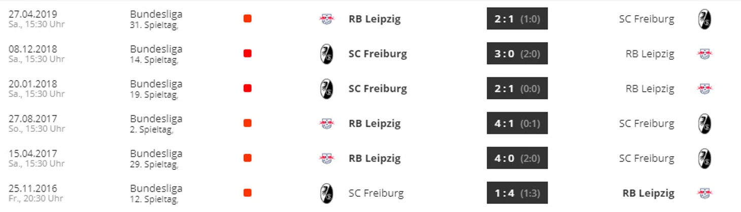 «Фрайбург» одержал победу в трех из четырех домашних матчах против «РБ Лейпцига» (один в первом дивизионе, два в Бундеслиге).