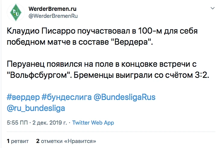 Клаудио Писарро выигрывает в своём 241-м матче Бундеслиги и проводит сотую победную игру за «Вердер». Писарро всего лишь второй футболист Бундеслиги после Айке Иммеля (118 побед за «Штутгарт» и 100 за «Дортмунд»), которому удалось сыграть больше ста победных матчей за две разные команды. Напомним, что Писсаро побеждал с мюнхенской «Баварией» 145 раз.