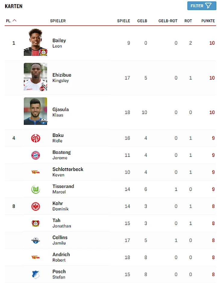 *игрок – кол-во игр – желтые – 1+1 желтые – красные – всего