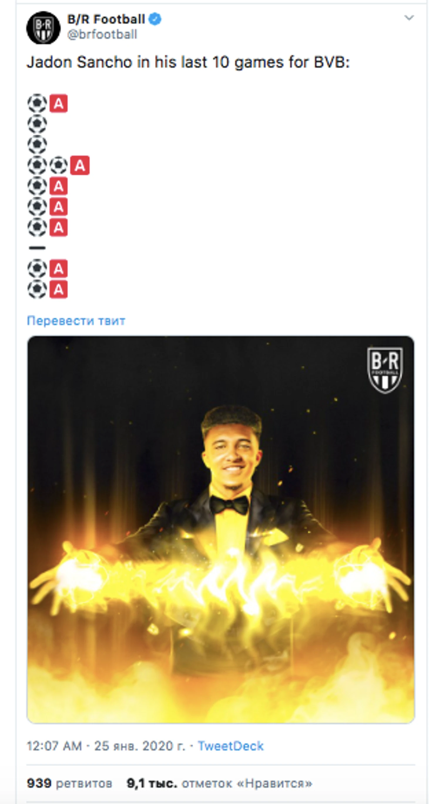 Голы и ассисты Джейдона Санчо в последних 10 играх.