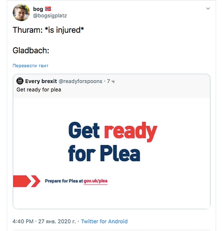 Тюрам: *травмируется* Гладбах: Готовьтесь к Плеа! (Игра слов - Plea - раздел заявлений на сайте британского правительства, на который и сделана ссылка в твите)