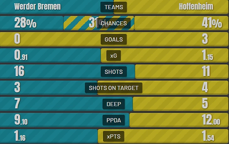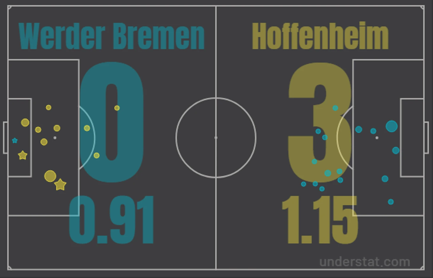 Первый там закончился со счетом 0:0 и команды ушли на перерыв. Второй так же оказался результативным для гостей. «Хоффенхайм» забил в ворота гостей три безответных мяча, тем самым заработав заветные 3 очка, что нужны любой команде с такой плотной ситуацией в турнирной таблице. С первым мячом гостям помог игрок «Вердера» Дави Классен, записав этот гол на свой счет. После розыгрыша углового и череды ударов Дави попытался выбить мяч от своих ворот ударом вверх, но мяч предательски опустился за линию, не оставив шанса голкиперу спасти момент.
