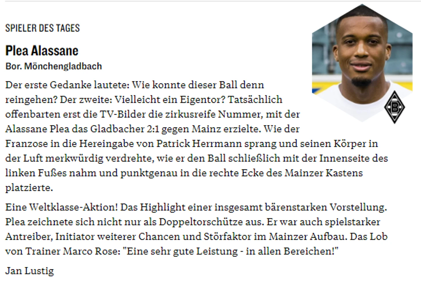 В следующем матче уже «Боруссия» из Мёнхенгладбах принимала в гостях футбольный клуб «Майнц». Игра получилась тоже богатой на забитые голы и не менее красивые, чем в матче с Дортмундской «Боруссией».