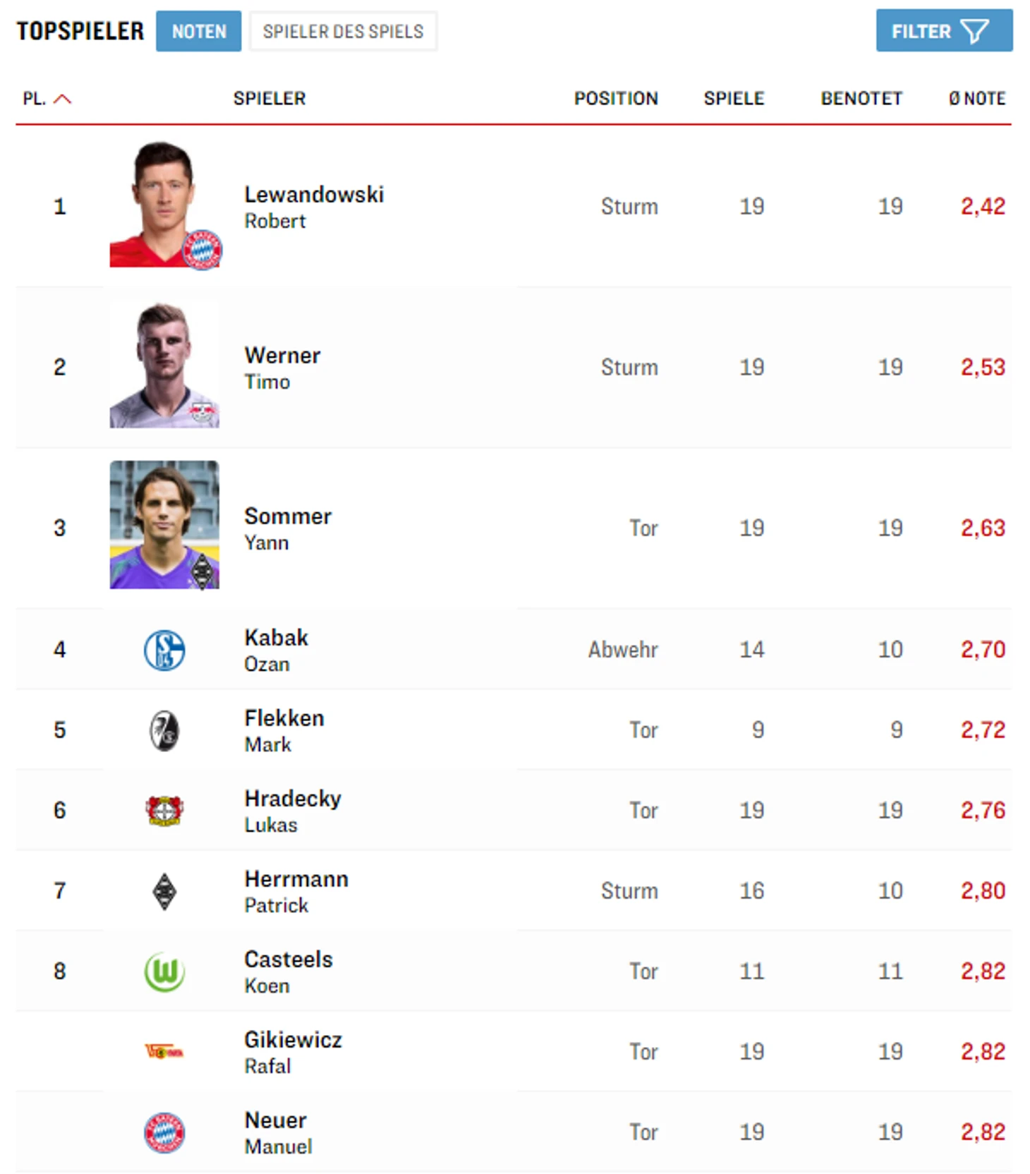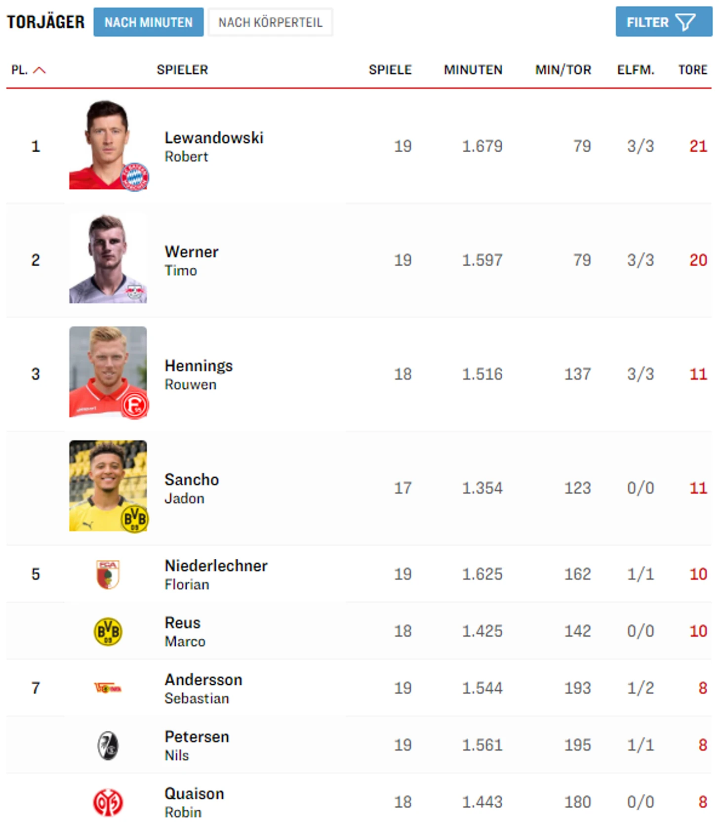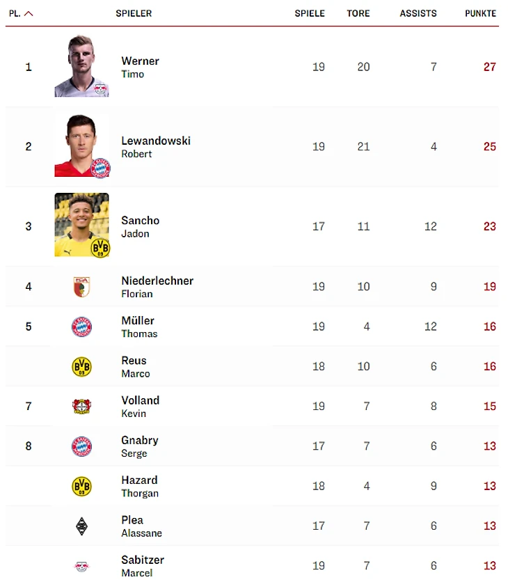 Кроме Роберта Левандовски только Герду Мюллеру удалось 21 мяч в первых 19-ти играх Бундеслиги. Роберт обогнал Тимо Вернера в таблице бомбардиров чемпионата.