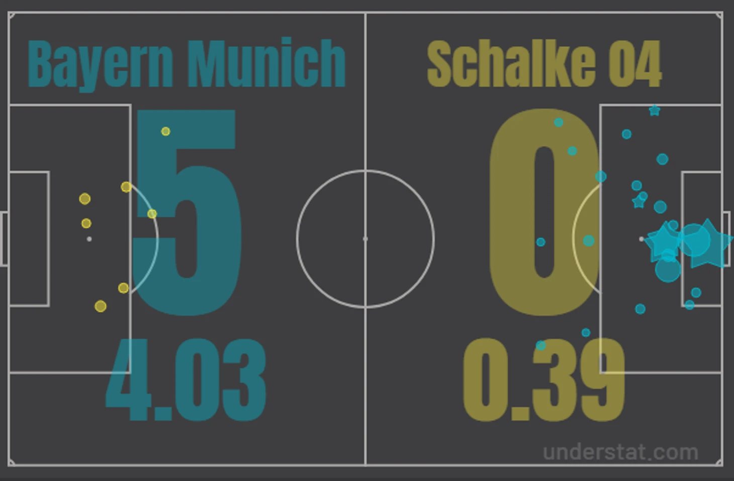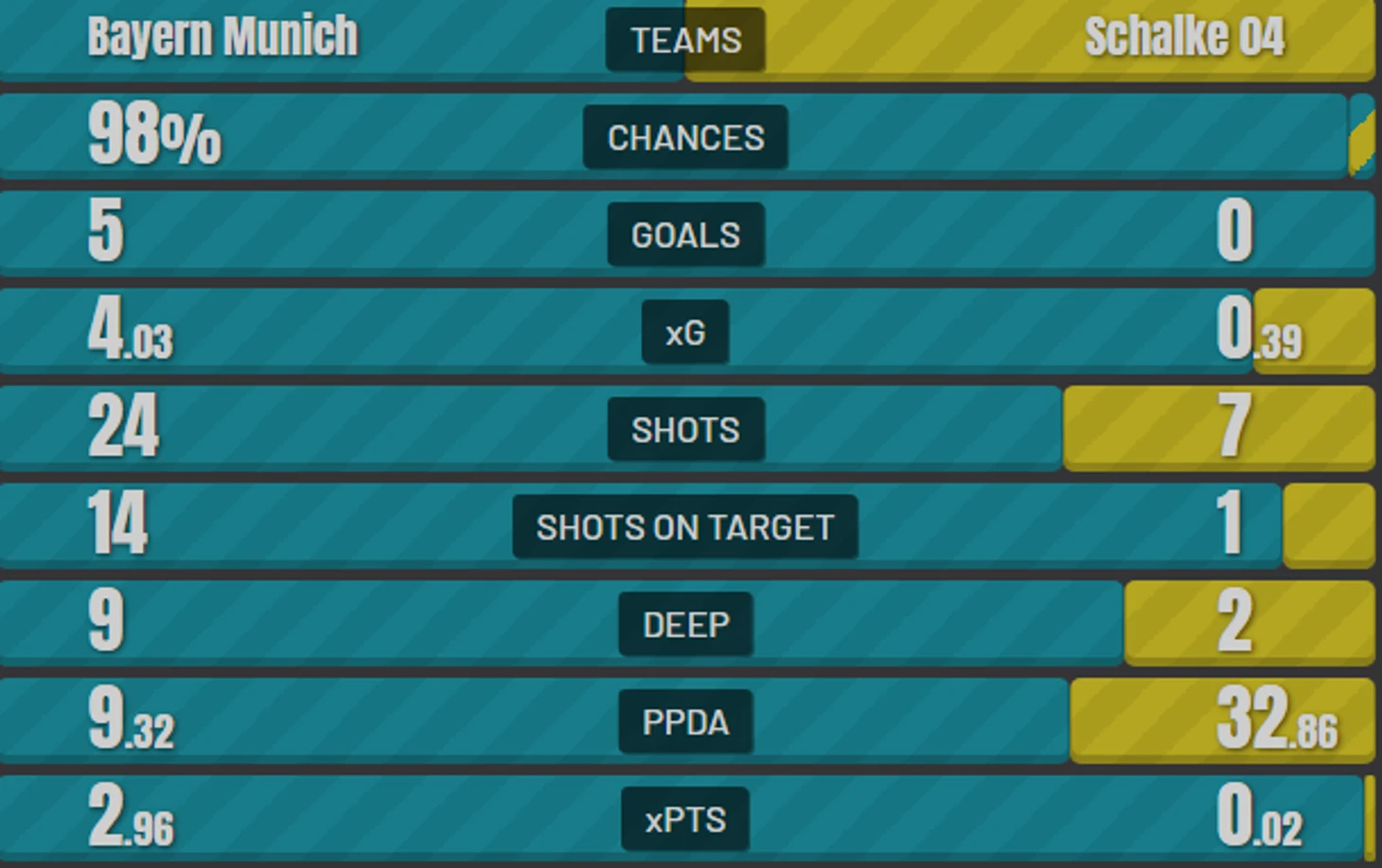 «Бавария» просто «расстреляла» «Шальке», не оставив ни единой надежды на другой исход встречи. Владение мячом также демонстрирует контроль команды над игрой. 74% против 26%. «Шальке» позволял бить сопернику, а с точностью у команды всё в порядке. Из нанесенных 14 ударов в створ ворот, семь оказались в сетке. Но и засчитанных голов было достаточно, чтобы разгромить соперника.