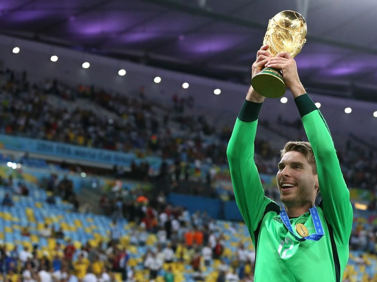 25-летний голкипер сборной Германии Рон-Роберт Цилер позирует с только что добытым Кубком Мира.