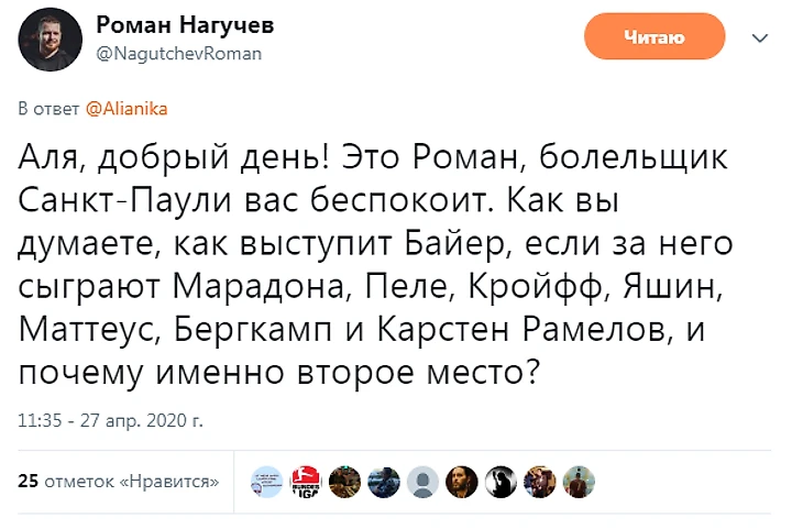 Очень интересные тексты всегда пишет Ваня Жидков, правда, последнее время довольно редко. Серега (Кривохарченко), увы, тоже редко теперь пишет, а ведь у него очень классный слог. =) Еще есть замечательный автор Миша Бирюков – мы с ним недавно почти день в день независимо друг от друга написали тексты про то, как фанаты в Германии помогают в борьбе с коронавирусом, но он обратил внимание на другие вещи, про которые я не знала. =) Потом, Оля Орлова переводит отличные материалы с немецких сайтов, у нее и свой блог здесь есть. Да и вообще на Трибуне последнее время появляется много классных материалов по немцам, что нас здорово поддерживает в тонусе, поскольку создает для нас конкуренцию. =)
