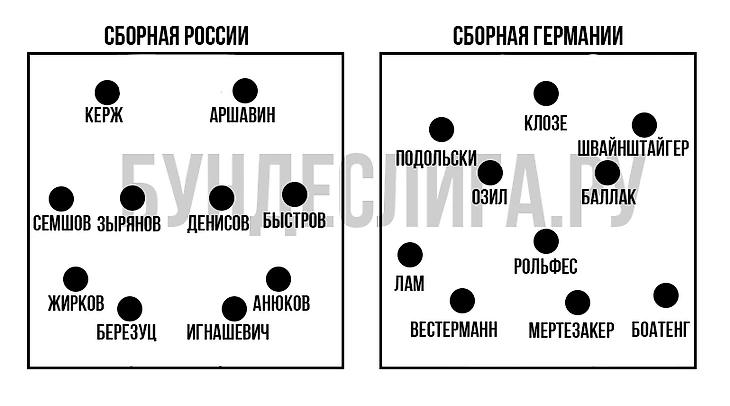 К счастью, ни сборная России, ни сборная Германии не имели никаких кадровых потерь в преддверии матча, а потому на поле вышли самые лучшие игроки страны. Да и вообще, перед нами была сильнейшая сборная России в истории и одно из сильнейших поколений немецкой сборной. Не верите? Просто напомним, каким игрокам обеих команд не нашлось места в старте: Мануэль Нойер, Сергей Семак, Марио Гомес, Роман Павлюченко, Леша Березуцкий и другие.