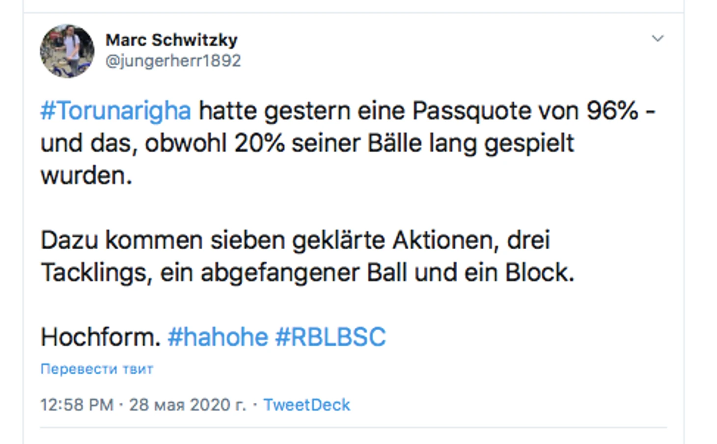 «Вчера у Торунариги было 96% процентов точных передач, при том, что 20% из них длинные. Есть также семь выносов мяча, три подката, перехват и блок. Топовая форма.»