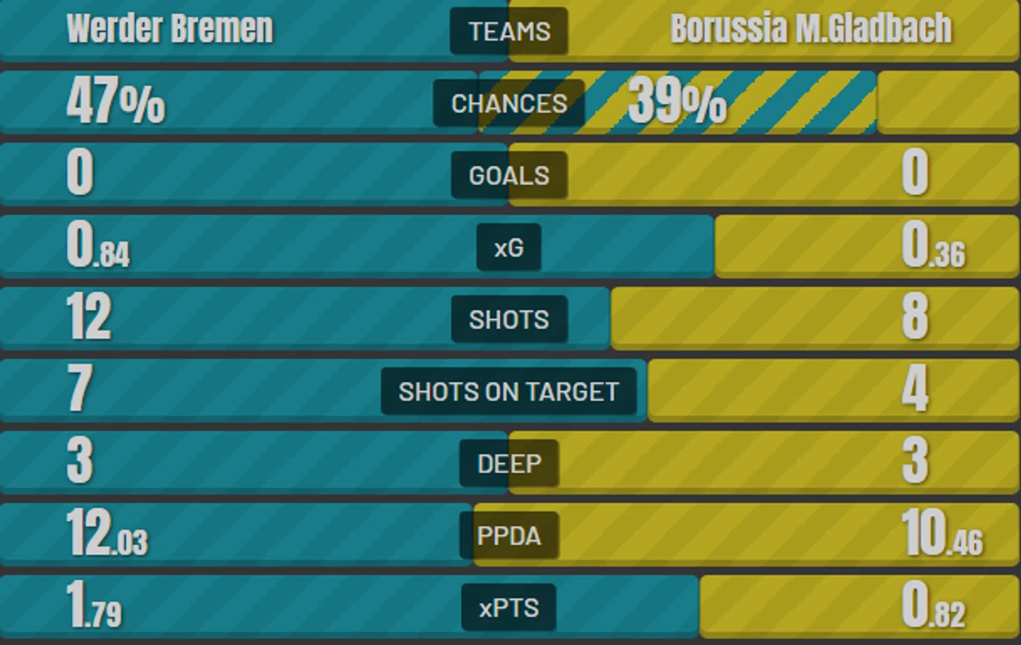 Несмотря на то, что команда из Гладбаха идет на самом верху турнирной таблицы, в этой игре очевидное преимущество было на стороне «Вердера». Невзирая на нулевую ничью, игра запомнилась грандиозными провалами в обороне «Боруссии», а также рядом феерических ошибок вратаря Яна Зоммера. Он неуверенно играл на выходах, при вводе мяча от своих ворот мог отдать его сопернику и так далее. Однако бременские «музыканты» умудрились за 90 минут не воспользоваться ни одним подарком из тех, что дарили им гости.