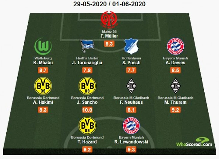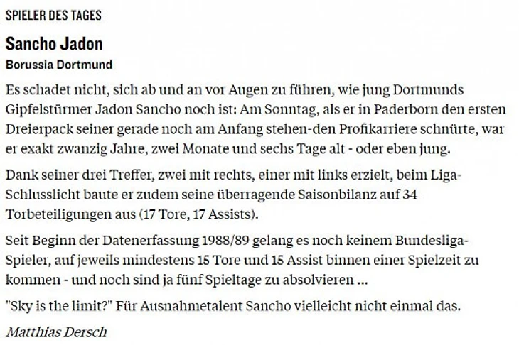 Джейдон Санчо забил свой 15-й гол в Бундеслиге, что сделало его первым игроком с начала детального сбора данных, который за один сезон 15 раз и более и забил, и отдал голевые передачи (15 голов, 16 ассистов). Также он самый молодой игрок в истории Бундеслиги, забивший 30 голов.