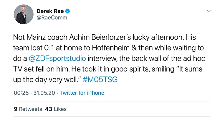 Тренеру Майнца Ахиму Байерлорцеру сегодня не везет. Его команда проиграла 0:1 и во время ожидания интервью временная стойка упала сзади на него. Он принял это с юмором и улыбаясь сказал «Это хорошо подытоживает сегодняшний день».