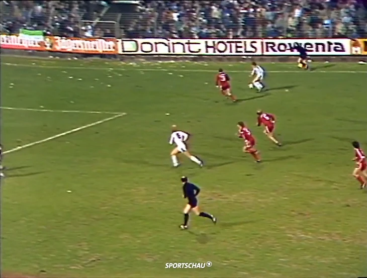 Уже на 21-й минуте на половине поля «Баварии» нападающий «Боруссии» выбил мяч на Уве Рана, тот отдал передачу на Краусса. Правый защитник «жеребят» эффектно, прокинув мяч между ног сопернику, отдал обратный пас на Уве, но мяч каким-то образом отскочил на никем не прикрытого Фронцека, который и открыл счёт.