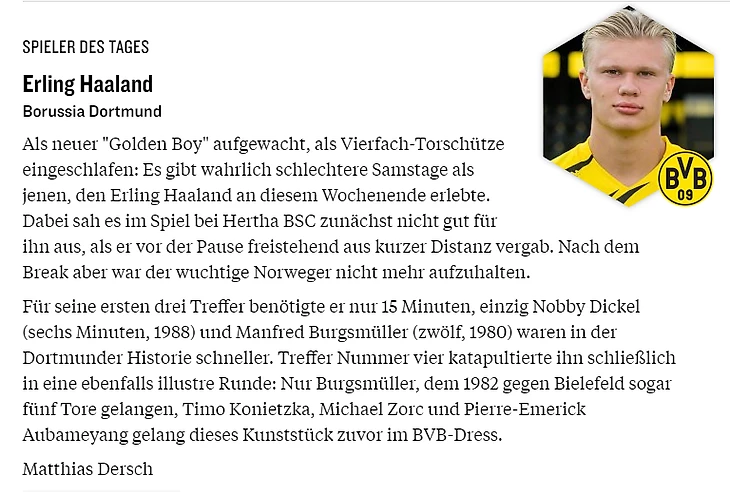 А во второй половине за дело взялся Холанд – в обороне берлинцев просто не нашлось игрока, способного его сдержать. Внешне очень легко норвежец отрывался от опекунов и врывался в свободные зоны, которые, надо отдать ему должное, он находил с потрясающим умением. Завершение тоже в этот день было на уровне – Холанд забил четыре мяча и просто нокаутировал «Герту», итоговый счет 2:5. Символично, что за пять минут до конца норвежца заменили на Мукоко, который дебютировал в Бундеслиге в 16 лет и один день – есть рекорд!