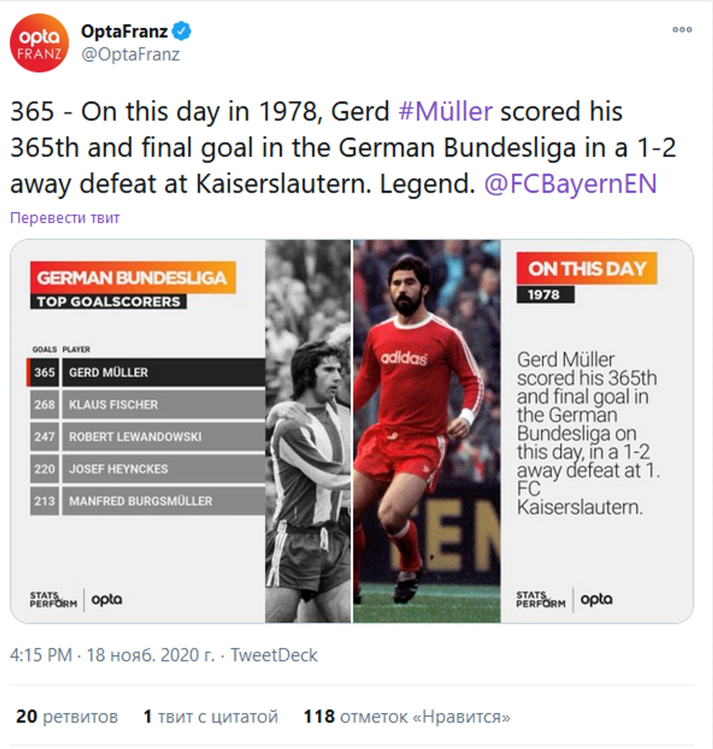 18 ноября 1978 года Герд Мюллер забил свой 365 и последний гол в немецкой Бундеслиге в выездной игре против «Кайзерслаутерна» («Бавария» проиграла 1:2). Легенда.