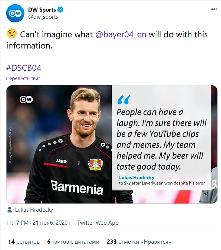 Сложно представить, что будет делать «Байер» с этой информацией. Градецки: «Людям теперь есть над чем посмеяться. Уверен будет куча видео на YouTube и мемов. Команда меня поддержала. Мое пиво сегодня будет вкусным».