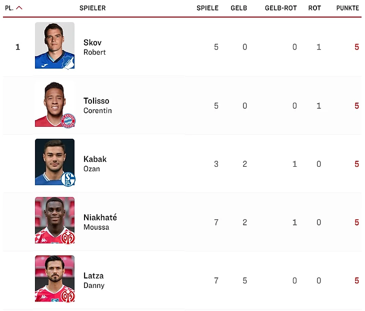 *игрок – кол-во игр – желтые – 1+1 желтые – красные – всего