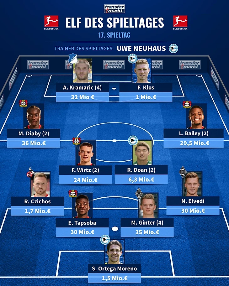 4 – Флориан Вирц из «Байера» забил свой четвертый гол в Бундеслиге. В 17-летнем возрасте только Тимо Вернер и Кай Хаверц забили четыре гола, но забивая четвертый, ни один из них не был младше Вирца, которому на момент последнего гола было 17 лет и 261 день.