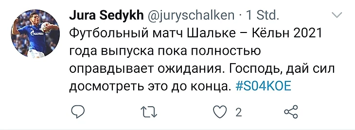 «Горняки» пытались выйти вперёд, но у них ничего не выходило, а исход матча решил Ян Тильман. Немец после шикарной передачи Рексбечая, которая, кстати, очень напомнила пасс Арнольда в матче с «Майнцем», забил гол. Итог встречи — 2:1 в пользу «Кёльна». «Шальке» вновь терпит поражение и остаётся на дне турнирной таблицы. «Кёльну» победа не сильно помогла, «козлы» расположились совсем недалеко от «горняков».