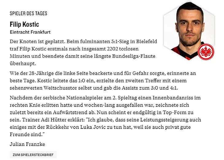 Но не будем умалять заслуг и его одноклубников, ведь «Айнтрахт» забил пять голов и лишь один из них на счету у Йовича. Например, дубль оформил Андре Силва, изящно распоряжаясь мячом у своей штрафной. Еще великолепный гол забил Костич — крученным ударом отправил мяч в сетку из-за пределов штрафной. Ну и не забываем про автогол Нильссона, пропитанным настоящей эстетикой в духе Юрия Ковтуна.