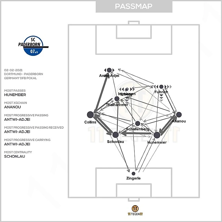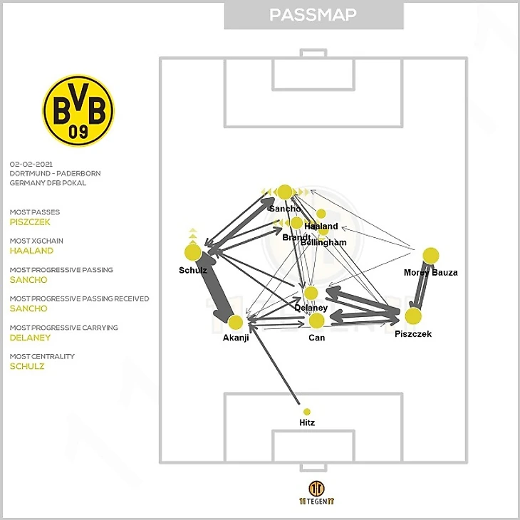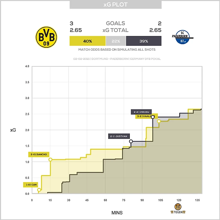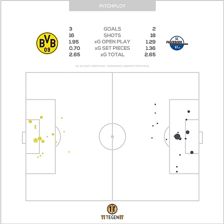 Во вторник «Боруссия» принимала боевой, но откровенно ниже по уровню «Падерборн», где дортмундцы были явными фаворитами, но оказалось все не так однозначно. Матч начался с полным преимуществом хозяев, и это дало свои плоды: после серии угловых, на подборе сработал Эмре Джан и вогнал мяч в сетку -1:0. Спустя четыре минуты, уже Эрлинг Холанд мог решать эпизод, но спас Леопольд Цингерле, а потом уже Нико Шульц не попал в пустые. Но и на том «шмели» не остановились, и Джейдон Санчо уверенно реализовал выход 1 на 1. Гости, после 20 минут спячки тоже решили, что пора отыгрываться, но Марвин Хитц сначала вытащил удар Србени, а потом, сложнейший выстрел Антви-Аджейя в угол. На перерыв «ноль-седьмые» ушли с надеждой. Второй тайм начался довольно скучновато. Игра была под контролем Дортмунда, но ближе к 70-й минуте коллектив Штеффена Баумгарта устроил откровенный навал на ворота Хитца, и спустя десять минут, после рикошета, Юстван отыграл один мяч. Самое интересное началось в добавленное время, где Эрлинг Холанд убежал в контратаку и сделал 3:1, казалось бы всё, но тут VAR решил вмешаться: Тобиас Штиллер посмотрел повтор, отменил гол и поставил пенальти в ворота Дортмунда - 2:2, гости смогли закончить начатое. В дополнительное время «Боруссия» была намного лучше, и при помощи Эрлинга Холанда смогла забить довольно спорный гол, который VAR, по итогу засчитал. Далее, уже Холанд и Геррейру имели убойные моменты, но реализовать их не смогли. Гости же пытались что-то создавать, но безуспешно. Таким образом, «Боруссия» придумала себе 136 минут, но в итоге прошла в 1/4, а «Падерборн» бился до конца, но не хватило класса