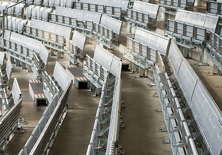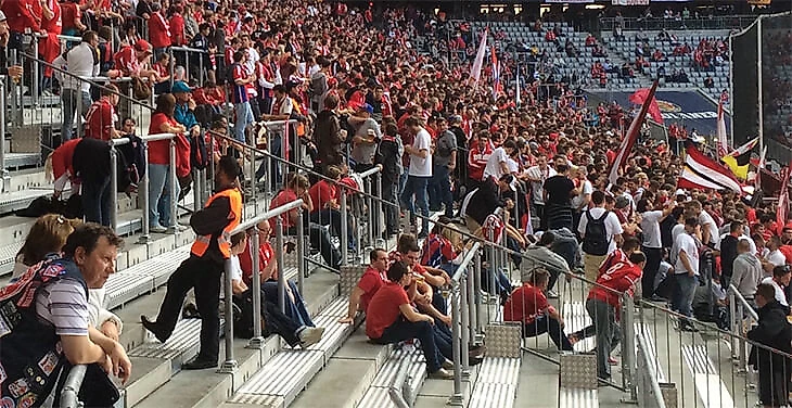 Вместимость «Альянц Арены» в Мюнхене сокращается не так сильно – с 75 до 70 тысяч. Здесь кресла достают буквально из-под полы: сиденья спрятаны в алюминиевых ступеньках. Это второй тип концепции «безопасного стояния» (fold-away seats). Его используют еще, к примеру, в Штутгарте и Дюссельдорфе.