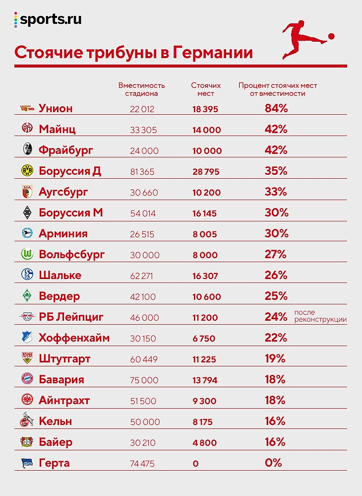 Примерно четверть всех мест на трибунах стадионов первой Бундеслиги стоячие. Только на двух аренах их нет вообще – на «Олимпийском стадионе» в Берлине и на «Ред Булл Арене» в Лейпциге. Но скоро столичный стадион останется единственным без стоячих трибун: к началу следующего сезона РБ завершит реконструкцию и откроет сектор без сидений на 11200 зрителей.