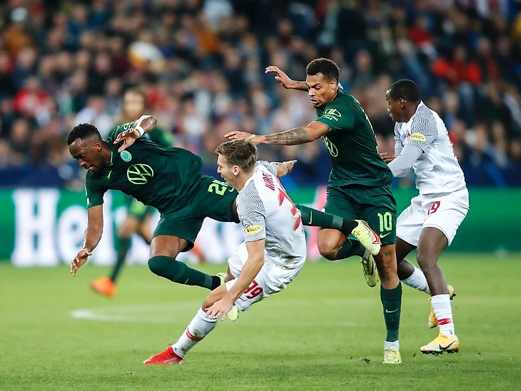 «Волки» пропустили в самом начале матча. «Зальцбург» расколол защиту гостей. Зайвальд отдал разрезающий пас, и Мбабу мог перехватить мяч, но Адейеми попросту обошёл швейцарца. Карим отобрал мяч, убежал от защитника и совершенно спокойно переиграл вратаря. Такие провалы в защите у «Вольфсбурга» случались настолько часто, что зрители не понимали, почему «быки» не забили больше. Вопреки игровой тенденции, на 15-й минуте «Вольфсбург» сравнял счёт. За это «волкам» стоит поблагодарить футбольного бога, удачу, красивую макушку Нмечи или левую ногу Арнольда, который записал на свой счёт голевой пас. После забитого мяча «Ред Булл» окрылил «Вольфсбург» и гости провели весьма неплохой отрезок: футболисты чаще уходили в позиционную атаку и даже создали несколько моментов, пощекотавших нервы Кёна.