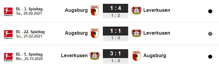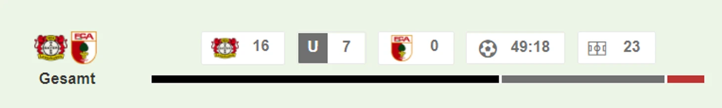 Еще никогда не было ни одной дуэли в элитном классе, где так часто одна из двух команд побеждала: на данный момент в 21 дуэли Леверкузен выиграл 14 игр и сыграл вничью семь раз. Леверкузенский «Байер» даже набрал 19 очков из возможных 21 в последних семи поединках Бундеслиги против «Аугсбурга».